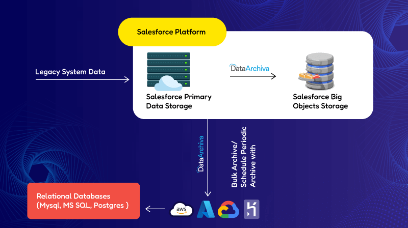 By leveraging DataArchiva, businesses can seamlessly move the legacy system data to Big Objects Storage or integrate Salesforce with cloud platforms such as Azure, AWS, and GCP, or connect to on-premises infrastructure. This allows for the systematic archiving of legacy data, ensuring it remains accessible within Salesforce while keeping primary storage free for processes and automation.